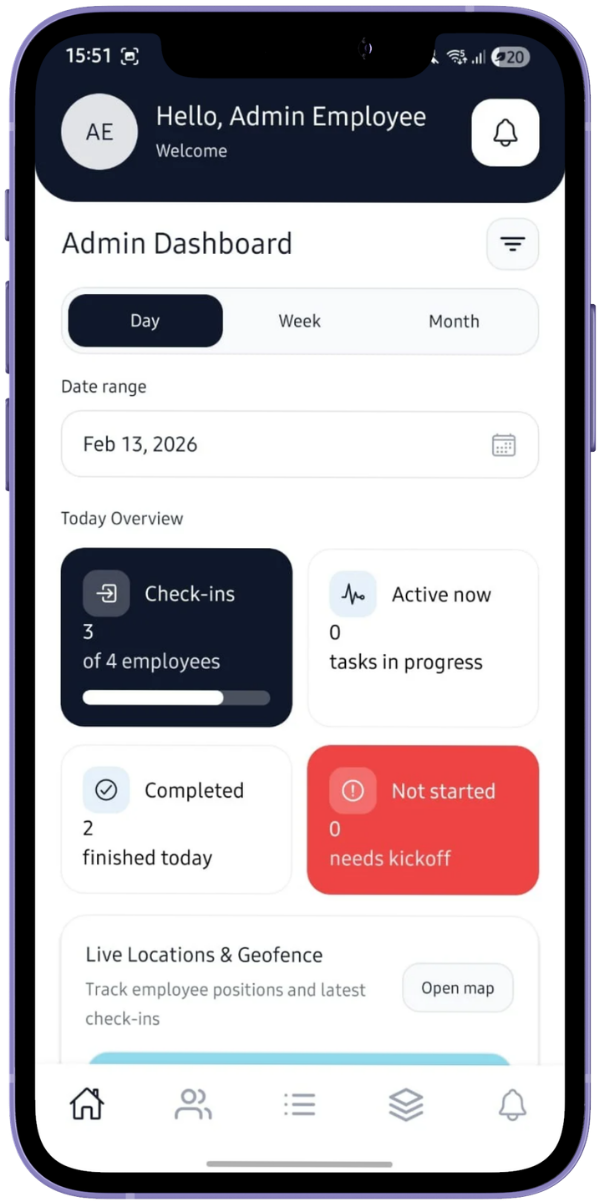 In traditional workflows, organizations rely on manual tracking, spreadsheets, and disconnected systems to manage attendance, activities, and reporting, which often leads to inefficiencies, lack of visibility, and delays in decision-making. This platform centralizes all workforce operations into a single system, enabling real-time tracking, structured reporting, and seamless management through a production-ready mobile application built with React Native and a scalable backend powered by .NET.